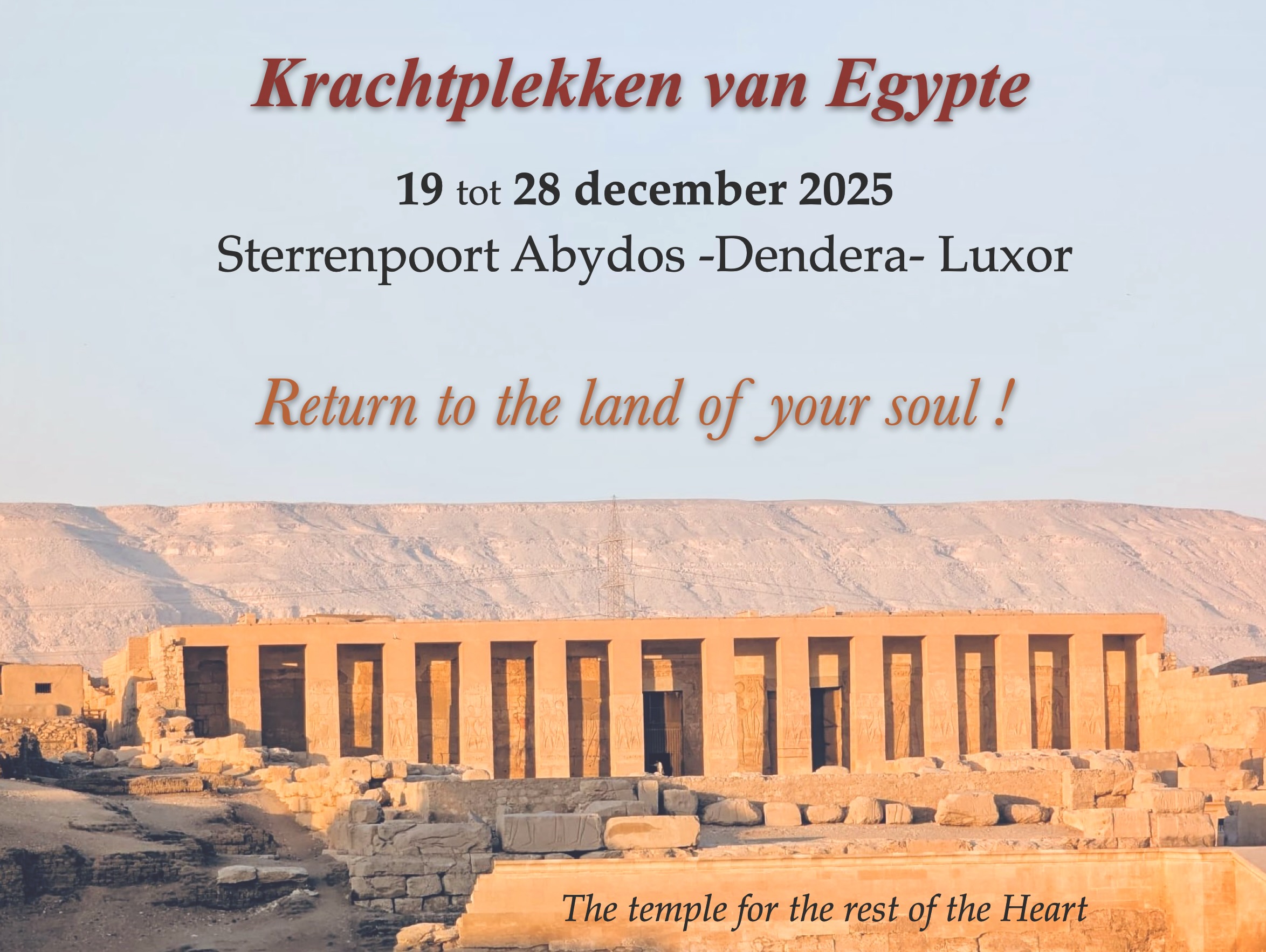 19 tot 28 December 2025; Krachtplekken van Egypte; o.a. Stargate Abydos, Dendera, Luxor (nog 2 plekken)